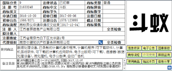 江苏首屏信息产业有限公司于2016年10月20日提交了第9类、第38类及第42类“斗蚁”商标的注册申请,并于2017年9月6日通过初审进入公告期。
