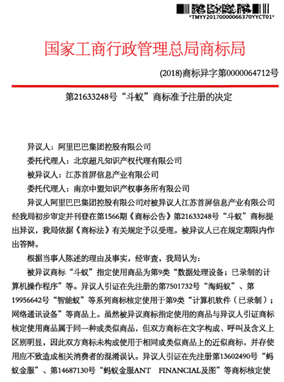 商标案例|首屏公司的“斗蚁” 商标被阿里巴巴集团异议后,结局如何?