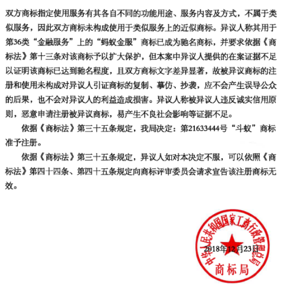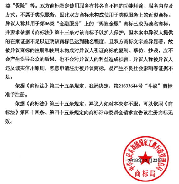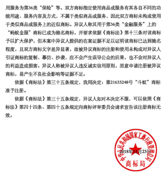 依据《商标法》第三十五条规定,我局决定:第21633644号“斗蚁”商标准予注册。