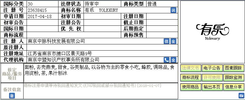2017年04月18日,南京中脉科技发展有限公司委托我所在第30类“面粉,去壳燕麦,甜食,谷类制品,以谷物为主的零食小吃,蜂胶,调味品,食用淀粉,茶,果汁刨冰”具体服务上申请注册“有乐Yolexury”商标。