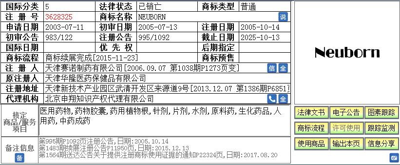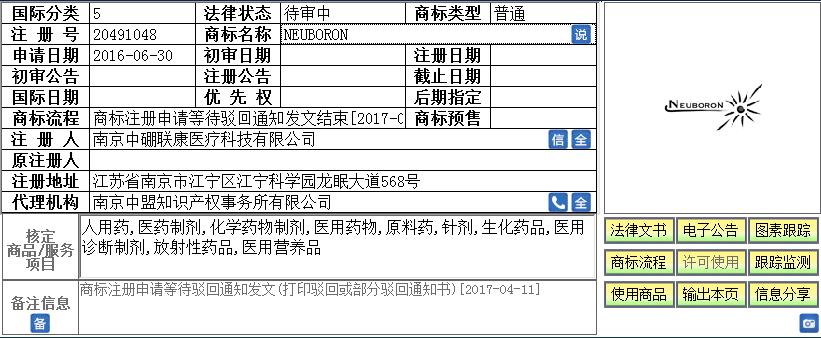 2016年06月30日南京中硼联康医疗科技有限公司委托南京中盟知识产权事务所有限公司办理了第05类“人用药,医药制剂,化学药物制剂,医用药物,原料药,针剂,生化药品,医用诊断制剂,放射性药品,医用营养品”商品上申请注册第20491048号“NEUBORON ”商标。2017年04月18日收到商标局关于该商标驳回的通知书,全部服务项目被驳回。