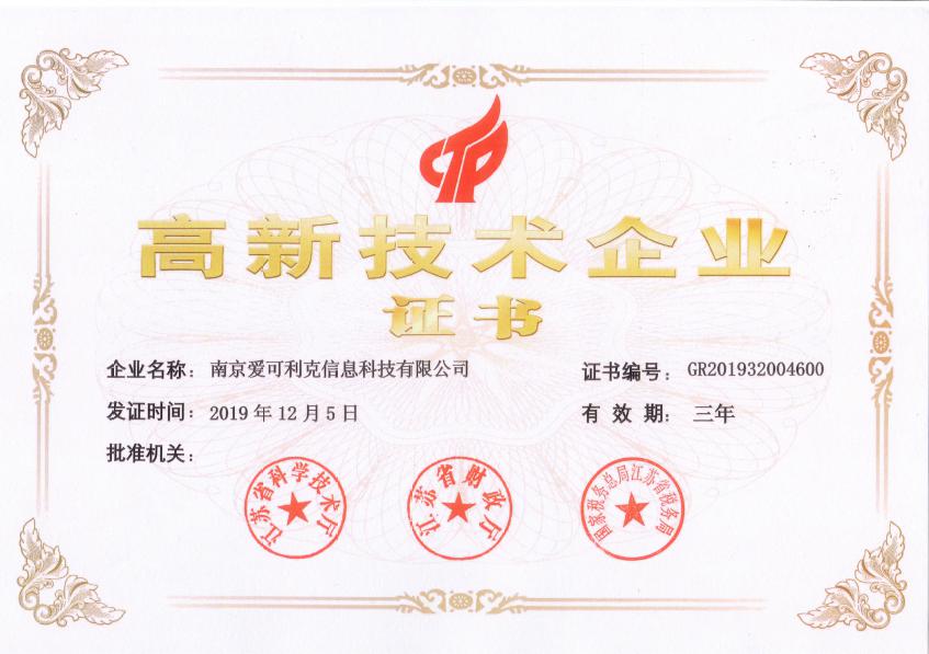 南京爱可利克信息科技凭借自身良好的条件,以及通过中盟知识产权事务所的辅导和代理,最终被成功认定为高新技术企业。