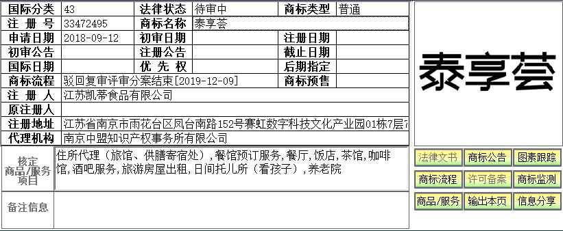 江苏凯蒂食品有限公司(以下简称申请人)于2018年9月12日在第43类上申请注册了第33472495号“泰享荟”商标,遗憾的是该商标的核心项目“餐厅;饭店”等服务项目被驳回。申请人是一家专业的餐饮管理企业,为打造“泰享荟”系列商标品牌已经耗费了大量的人力和财力,而且具备了一定的知名度。申请人对该商标给予厚望,其指定的核心服务项目被驳回也给申请人造成了很大的困扰。