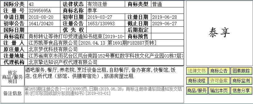 经复审查明:驳回决定中引证的第32995695A号“泰享”商标(以下称引证商标)现已转让至申请人名下,复审商标与引证已不存在权利冲突。故决定:复审商标在复审服务上的注册申请予以初步审定(通过审核),争取到应有的权利。